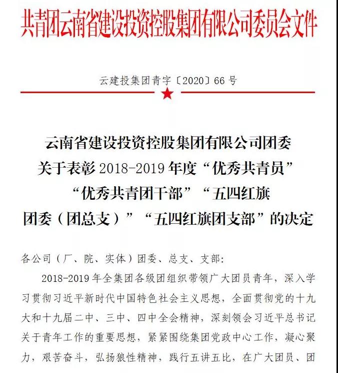 公司團(tuán)委獲評2018-2019年度云南建投集團(tuán)“五四紅旗團(tuán)委(團(tuán)總支)”