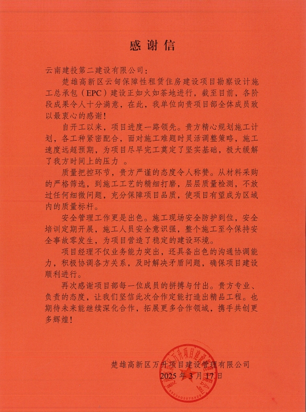 信中對公司在楚雄高新區(qū)云甸保障性租賃住房建設(shè)項目中的卓越表現(xiàn)給予了高度評價與誠摯感謝。信中指出,自項目開工以來,項目進(jìn)度一路領(lǐng)先,施工速度遠(yuǎn)超預(yù)期,項目質(zhì)量把控嚴(yán)格,安全管理出色,項目經(jīng)理業(yè)務(wù)能力突出,各階段的成果令人十分滿意。并表示期待未來能繼續(xù)深化合作,拓展更多合作領(lǐng)域,攜手共創(chuàng)更多輝煌。