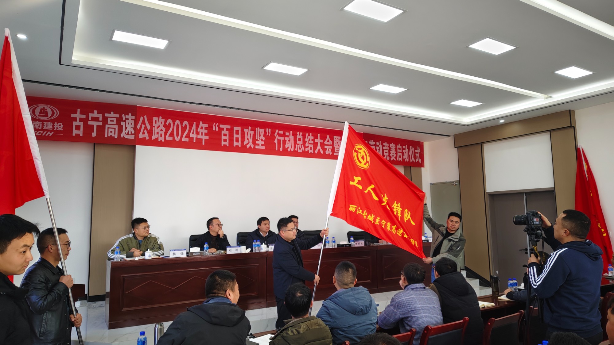 會(huì)上,第七直管部麗江古寧高速土建三分部項(xiàng)目負(fù)責(zé)人作為先進(jìn)代表進(jìn)行發(fā)言,項(xiàng)目部被授旗為“工人先鋒隊(duì)”。