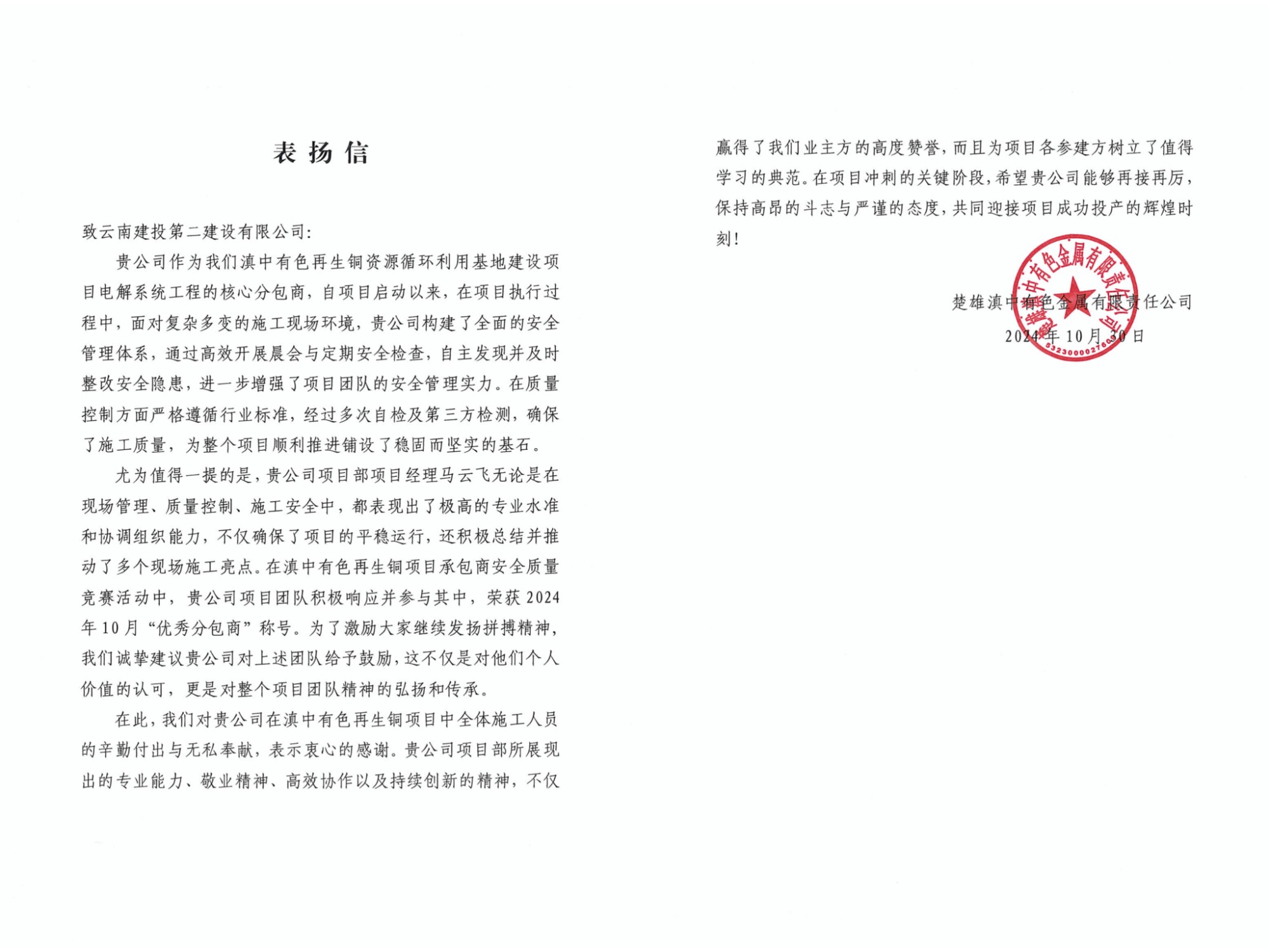 近日,公司收到一封來自楚雄滇中有色金屬有限責(zé)任公司的表揚(yáng)信。信中褒揚(yáng)了公司在滇中銅項(xiàng)目實(shí)施過程中展現(xiàn)出的專業(yè)能力和敬業(yè)創(chuàng)新精神,感謝了項(xiàng)目全體施工人員的辛勤付出和無私奉獻(xiàn)。
