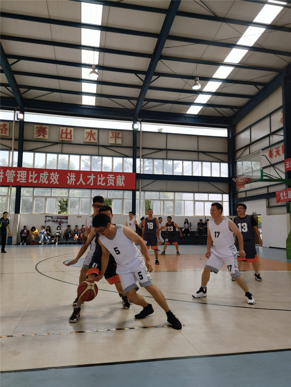 只聽裁判員一聲哨響,比賽開始了。雙方你來我往,比分緊咬,精彩鏡頭不斷上演,搶斷、帶球過人、虛晃、轉(zhuǎn)身、跳投,一整套動(dòng)作行云流水般一再重現(xiàn),一陣陣喝彩與加油響徹球場(chǎng)內(nèi)外。經(jīng)過激烈角逐,公司機(jī)關(guān)1隊(duì)以43:19贏得了第一場(chǎng)勝利。