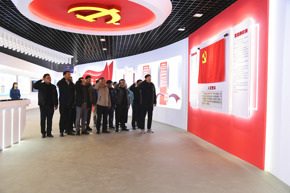 周青松一行在建設產業(yè)化分公司黨支部相關負責人的介紹中,參觀了黨支部黨員活動陣地,并由顏林帶領全員重溫入黨誓詞。在觀看了公司項目管控中心數(shù)據(jù)“駕駛艙”后,周青松一行高度贊揚了公司項目管理新模式。