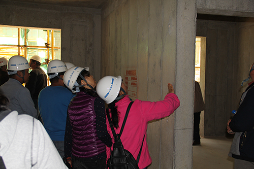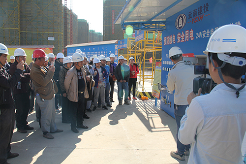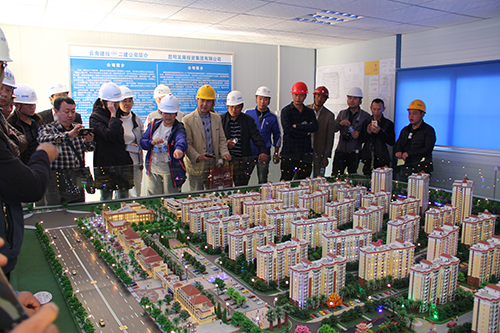 在進入施工現場參觀前,項目部管理人員對觀摩團人員做了安全交底,介紹進入施工現場過程中應注意的具體事項。參觀各棟號施工現場中,安全通道里的各種安全宣傳標語和圖解內容依次向觀摩團展示了施工現場應注意的安全事項和安全操作規(guī)范,樓層內部各結構和施工環(huán)節(jié)的工藝展示不時得到了觀摩人員的稱贊,各棟號管理公示牌向觀摩團詳細介紹了樓層的面積、結構、工作內容計劃以及具體負責人信心等內容,工具化的鋼筋加工棚、工具房、安全防護棚等依次向觀摩團展示了定型化設備的優(yōu)勢。在項目總承包部,觀摩團來到沙盤展示區(qū),對宜良棚改項目的設計、整體形象以及各區(qū)域的功能布局進行了參觀。
