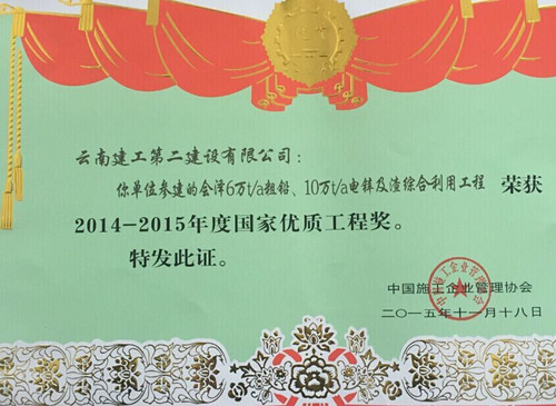 12月18日,在北京舉行的2014—2015年度創(chuàng)建國家優(yōu)質工程總結表彰大會上,由公司參建的會澤馳宏鋅鍺6萬t/a粗鉛、10萬t/a電鋅及渣綜合利用工程榮獲2014—2015年度“國家優(yōu)質工程銀質獎”,公司董事長陳定華獲得2014—2015年度“國家優(yōu)質工程獎突出貢獻者”稱號。